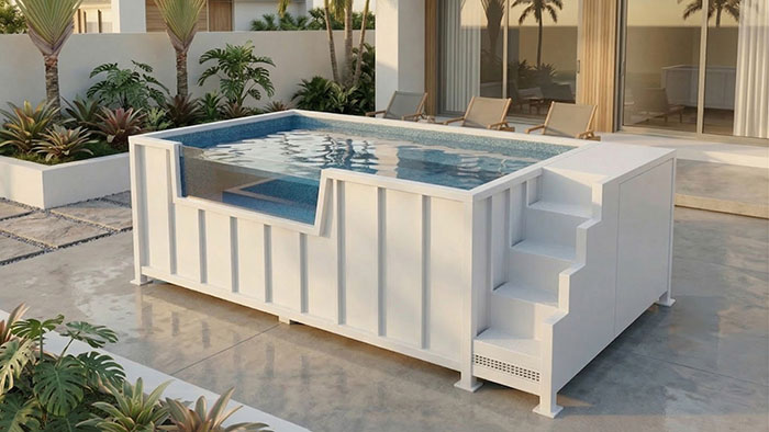 El Cove 14 es una piscina modular elevada, con estructura de acero soldado y pintura epóxica anticorrosiva. Es pesada, sólida, y está diseñada para durar décadas en el clima del Caribe.